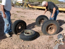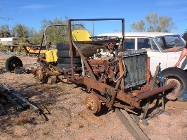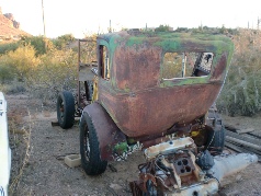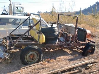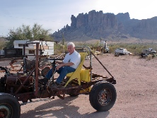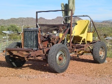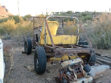 This is a buggy built on a copped Dodge pickup frame with a 365 Caddy V8 with an auto transmision. It was built in the 60's and parked here in the Arizona desert in 1972. A few parts (Carb., one seat, radiator cap) were taken off of it over the years. The seat remaining is out of an old Piper Cub plane. As you can see the tires are flat. With the new tires on it and the help of my friend Tom Merten, we were able to pull it up to his house in Apache Junction, AZ. It rolled real easy and nothing was frozen up. That dry desert air helps preserve things. I will pick it up and bring it back to Lucile were I can start work on it. I planed on turning it into a real "RAT ROD" complete with all the rust it will stand. I went back with a car trailer and hauled it to Lucile. I did some work on this and never quite finished it before we moved down to Green Valley, Arizona. I sold it to a guy in Washington that will finish it.