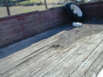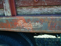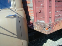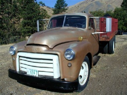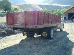 The truck has a hydraulic dump bed with wood bed and sides. It was used as a grain truck for many years.